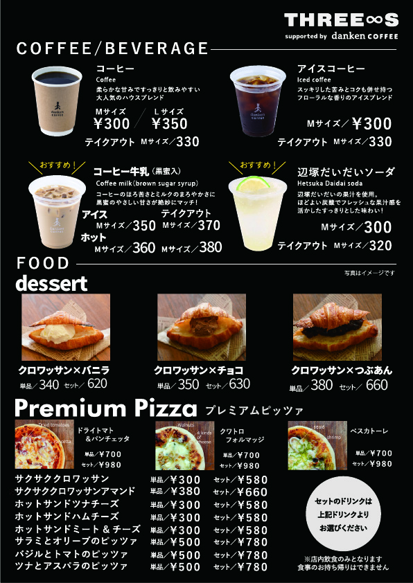 THREE∞S レギュラーメニュー新商品追加 2026.02.03 いつもTHREE∞Sをご利用いただきありがとうございます。 2026年2月1日からレギュラーメニューに、新商品dessertが追加いたしました。クロワッサン×バニラ、クロワッサン×チョコ、クロワッサン×つぶんです。 【お知らせ】指定管理者体制変更について 前の記事 THREE∞S はじめましたスムージー 次の記事 新着のお知らせ THREE∞S 2/1-28 スムージーキャンペーン 2026.02.03 THREE∞S はじめましたスムージー 2026.02.03 【お知らせ】指定管理者体制変更について 2025.12.12